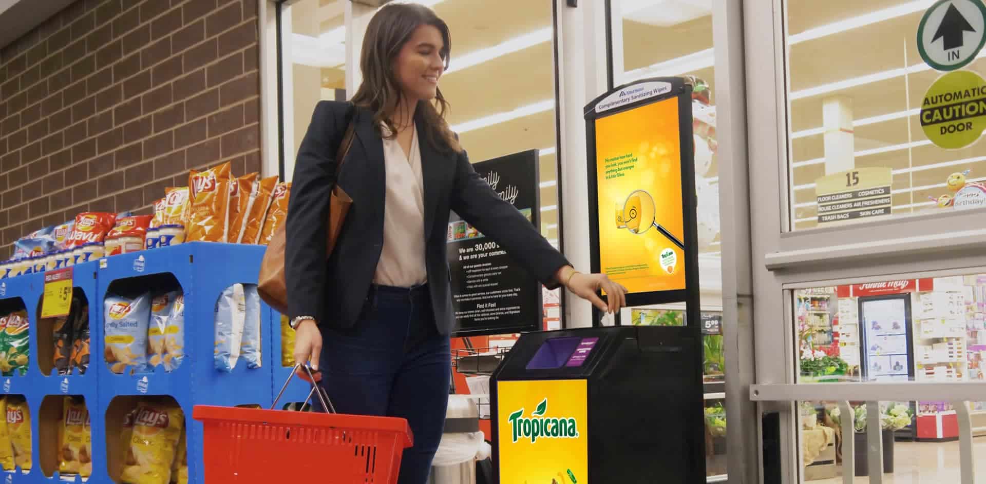 Our exclusive 5’5” tall static and digital wellness kiosks (offering free sanitizing wipes to consumers), put your brand front and center in top retailers across the U.S., keeping them healthy and informed.